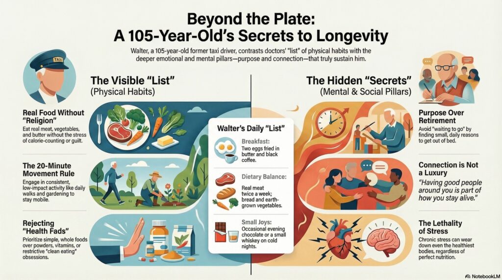 “105-year-old Walter argues that extreme dietary restriction and exercise are not the primary keys to a long life. While he maintains a simple routine of eating real food and staying active, he emphasizes that many health-conscious individuals he knew died young due to unmanaged stress and a lack of meaning.”