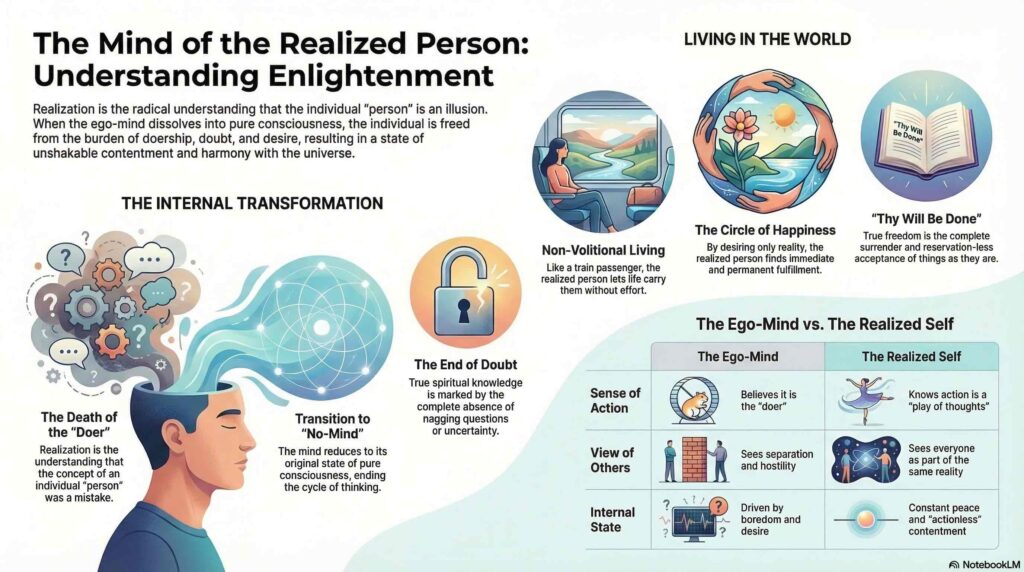 Many seekers have their own ideas about what it means to be realized. But what does realization really mean? In the first place, there is no duality for such a person. All is One. Again, some people imagine that Oneness means a kind of permanent mystical vision, in which one can automatically penetrate into the essence of things, read minds, see other peoples’ past lives, and so on.
