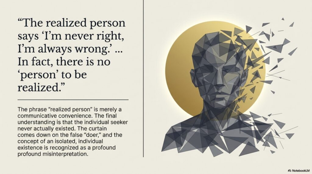 The phrase “realized person” is only used for the purposes of communication, to indicate that there is a fundamental change that occurs, and which is called realization or enlightenment. In fact, there is no “person” to be realized. Realization is really the understanding that the concept of individual existence as a “person” was an illusion, a mistake, a misinterpretation. The so-called realized person knows this very well and so he