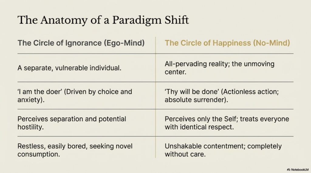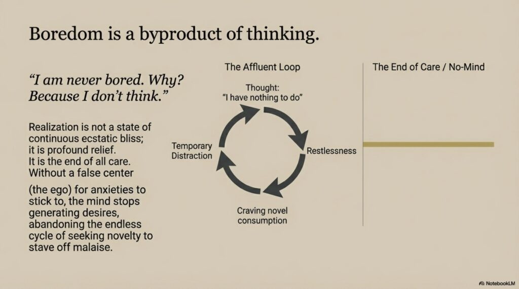 However it comes, final understanding means the end of all care. Mind has become no- mind and so there is no longer any false center to which care and anxiety can stick. Consciousness has turned back to its true center, where it remains immersed in itself, contemplating its own existence.