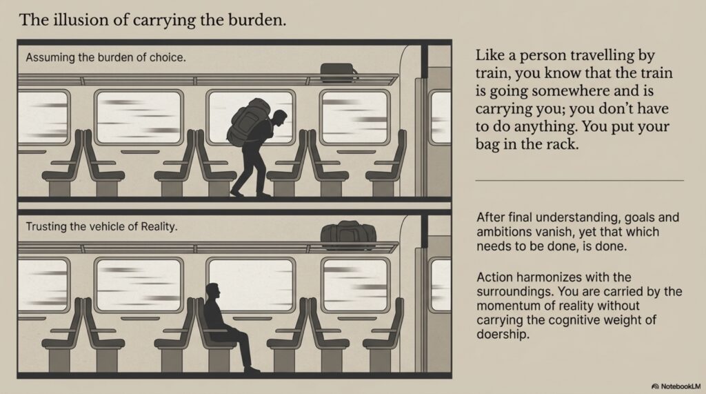 After final understanding, you find that you understand whatever you need to understand. Ideas which were previously unclear become clear as daylight to you. That understanding is like a power that is manifest in you. You feel in harmony, in tune with your surroundings. You feel that what is happening is right, and could not be otherwise. Because you feel this power in you and around you, your actions are also “correct.” You find yourself without goals or ambitions, but still, that which needs to be done, is done. Like a person travelling by train, you know that the train is going somewhere and is carrying you; you don’t have to do anything. You put your bag in the rack. You don’t carry it on your back any longer.