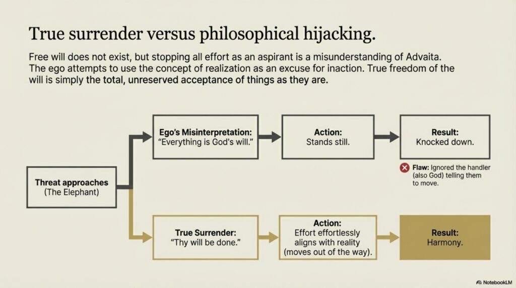 As an aspirant, however, you cannot simply say “thy will be done” and stop making any effort. To go that way is to misunderstand Advaita. This mistake is illustrated by the story of the man who stood in the way of the elephant. The elephant’s handler called out to the man to move but the man just said “I am God, the elephant is God, everything is God’s will.” Of course, he was knocked down and injured by the elephant. When he complained to his guru, saying that he had only repeated what the guru had told him, the guru said “the elephant’s handler, who told you to get out of the way, was also God, but you chose to ignore Him at that point.”