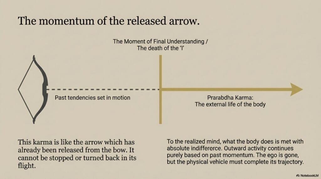 After realization, you find that you don’t mind how things go, whether you do one thing or some other thing. Why do you feel such indifference? Because you know that all that activity doesn’t really have anything to do with you. It is all happening according to the prarabdha karma, that is, according to those tendencies which have already been set in motion and which must come to fruition through the body and mind. This karma is like the arrow which has already been released from the bow. It cannot be stopped or turned back in its flight. That is your external life after realization. There is nothing for you to do. Similarly, when you know everyone is yourself, you don’t crave the company of particular people. You get on perfectly well with anyone and you are inclined to treat everyone with the same respect.