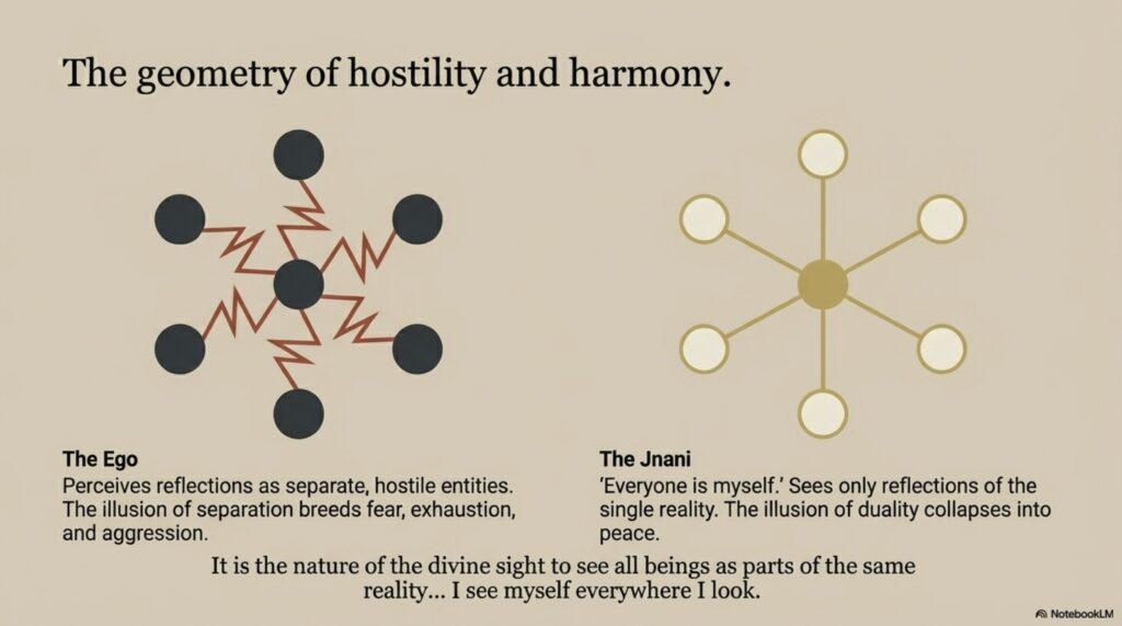 It is the nature of the divine sight to see all beings as parts of the same reality, and so the jnani (realized person) thinks “Everyone is myself. I see myself everywhere I look.” The ego, on the other hand, is like the dog. It sees others as separate and as potentially hostile. The sense of separation creates fear, which leads to aggression. There is no peace for the ego, or for a world in which the ego is dominant.
