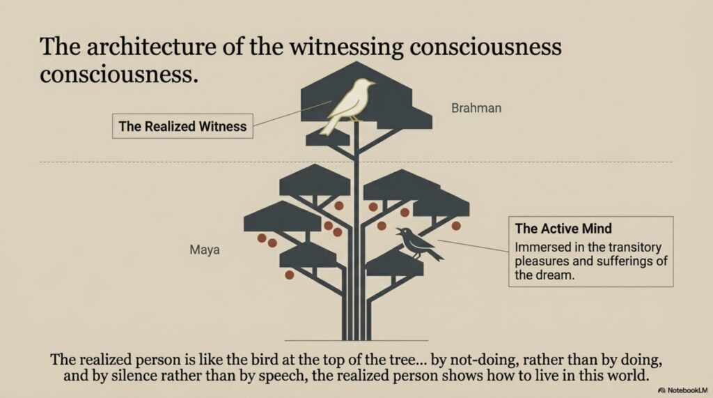 There are two birds in a tree. One of them constantly flits from branch to branch, eating the fruits that grow among the leaves. The other sits quietly at the top of the tree and does not taste or eat any of the fruits. The realized person is like the bird at the top of the tree. As far as he or she is concerned, the world is not true. It is nothing but a long dream. He or she has no desire for the transitory pleasures of life and so does not touch them. In this way, by not-doing, rather than by doing, and by silence rather than by speech, the realized person shows how to live in this world.