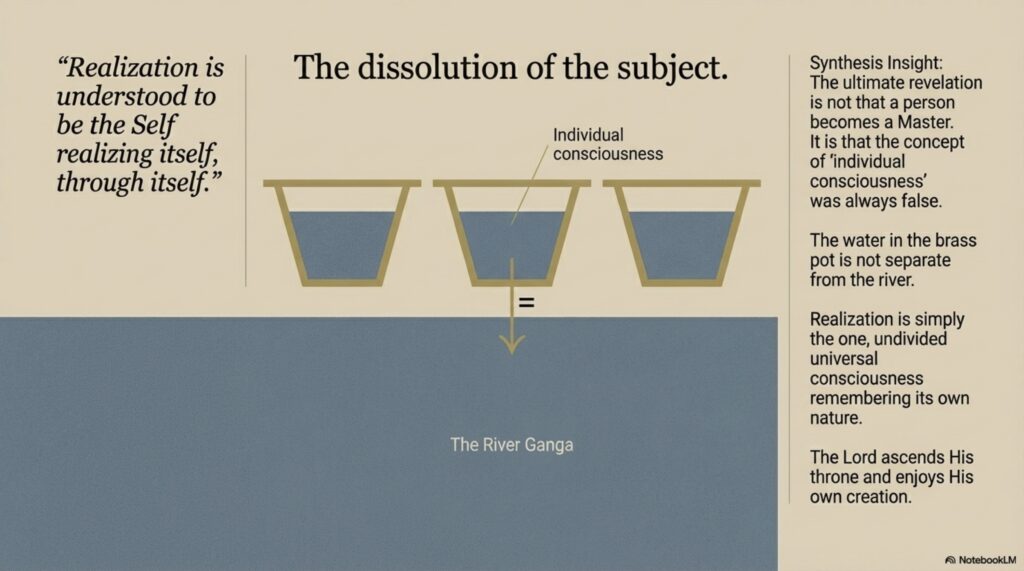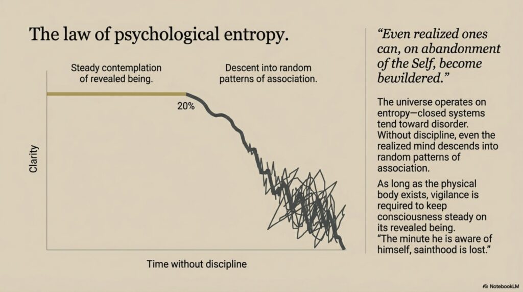 You don’t have to say to yourself “I am He, I am the Self,” because you just know. Your being is your knowing. You have no further use for “spirituality.” One who has come to the end of the journey no longer needs the map or the directions for how to get there. Even so, you cannot simply let your mind drift and wander wherever it wants, like a bad servant. As long as the body is there, the mind should remain steady in the contemplation of its revealed being.