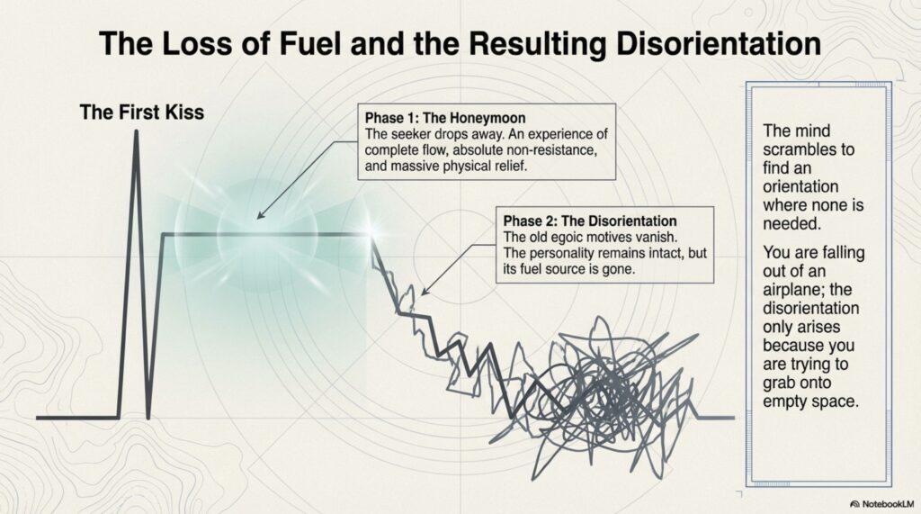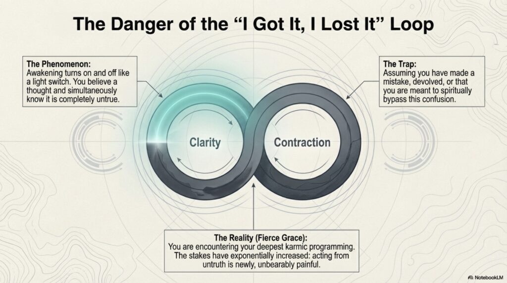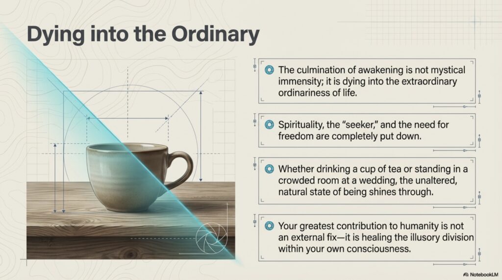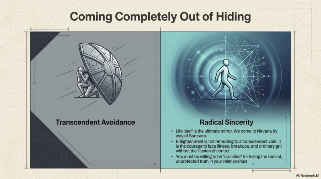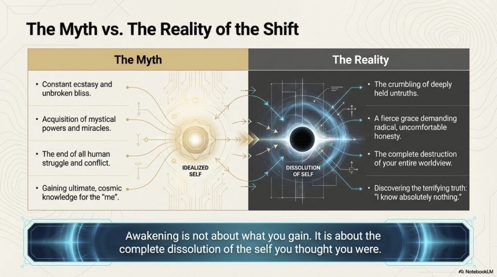 Adyashanti’s The End of Your World provides a candid roadmap for the disorienting transition that follows a spiritual awakening. The author distinguishes between momentary glimpses of oneness and a permanent, abiding realization, noting that initial breakthroughs often trigger a dissolution of the egoic self and its previous motivations. This process frequently involves a “honeymoon phase” of bliss followed by a “got it, lost it” cycle where prior conditioning and “Velcro thoughts” pull the individual back into a sense of separation. Adyashanti emphasizes that true enlightenment requires radical sincerity and a willingness to stop hiding from one’s own humanity and imperfections. Ultimately, the text argues that awakening is not an escape from life, but an invitation to engage fearlessly with reality through honesty and the release of all inner division.