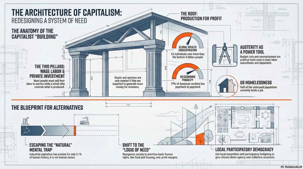 The provided sources explore the work of economist Clara Mattei, who challenges the idea that capitalism is a natural or inevitable system. She argues that the current economic order is a political construction maintained through austerity, a tool used by elites to ensure a dependent and disciplined workforce. According to Mattei, the system’s two pillars—private investment and wage labor—prioritize profit over human needs, leading to extreme inequality and social instability. She highlights how economic models often depoliticize these power dynamics, framing poverty and unemployment as individual failures rather than systemic requirements. Ultimately, Mattei advocates for re-democratizing the economy through local, participatory movements to reclaim collective agency. Her work suggests that because humans designed this framework, they also possess the power to architect alternatives focused on social well-being.