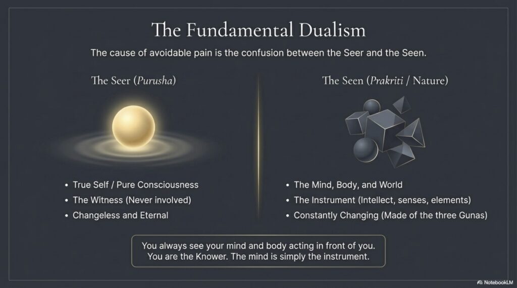 - Philosophically it is rooted in Sāṅkhya dualism: puruṣa (consciousness) and prakṛti (nature) are distinct principles.