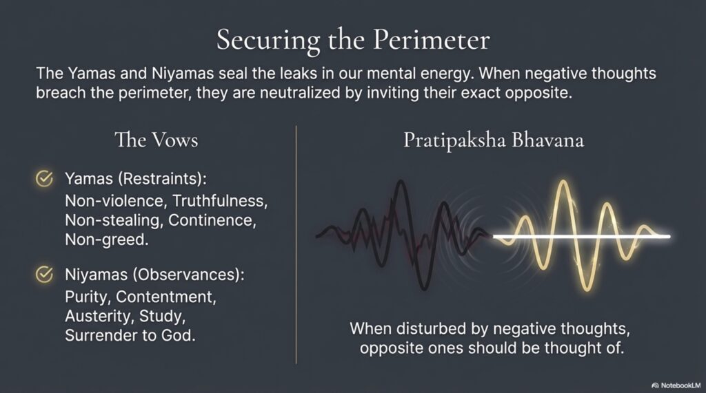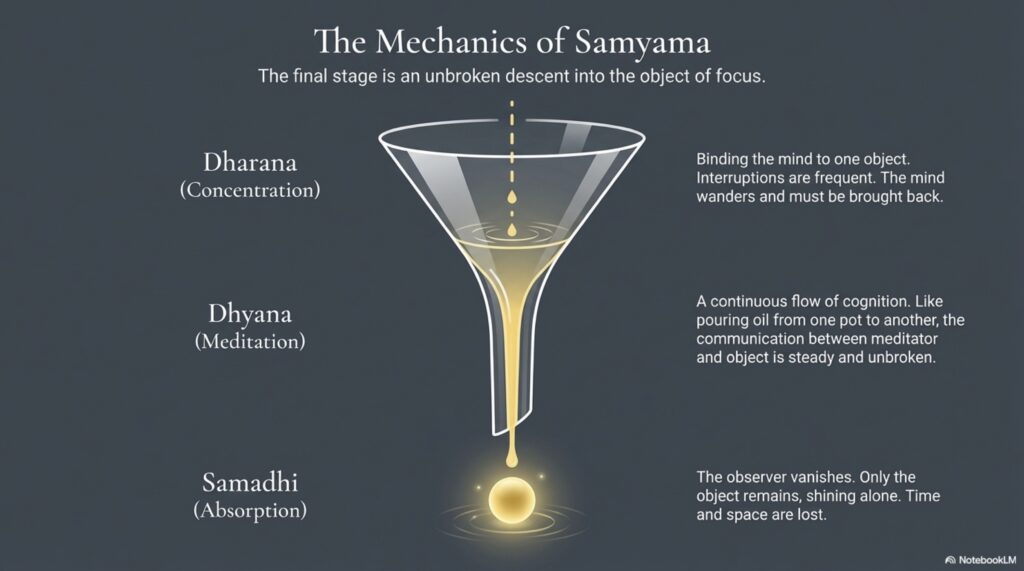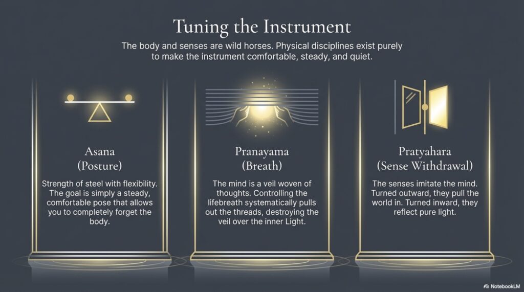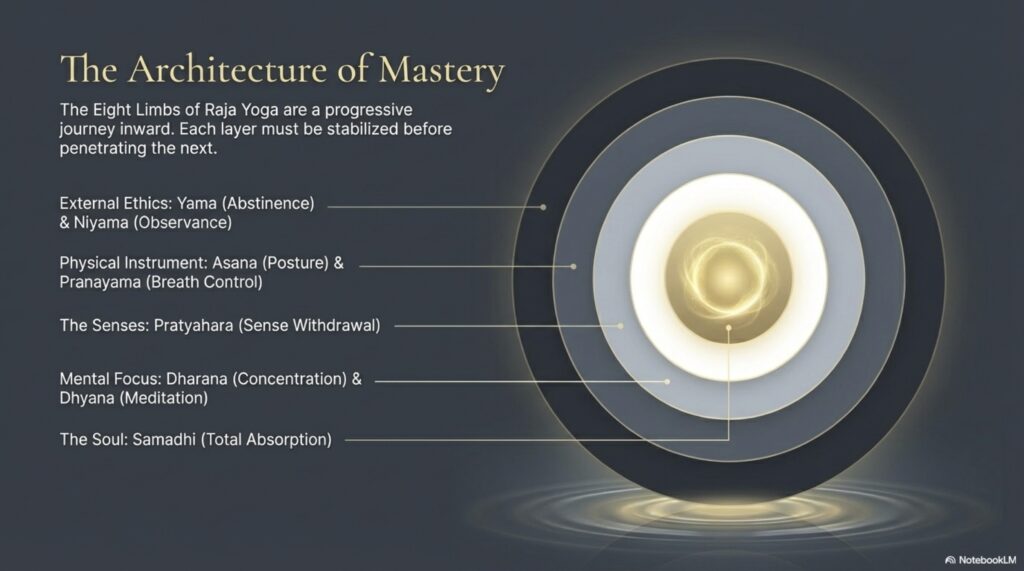 - It lays out the eight limbs: yama, niyama, āsana, prāṇāyāma, pratyāhāra, dhāraṇā, dhyāna, samādhi, a graded path of discipline and meditation.